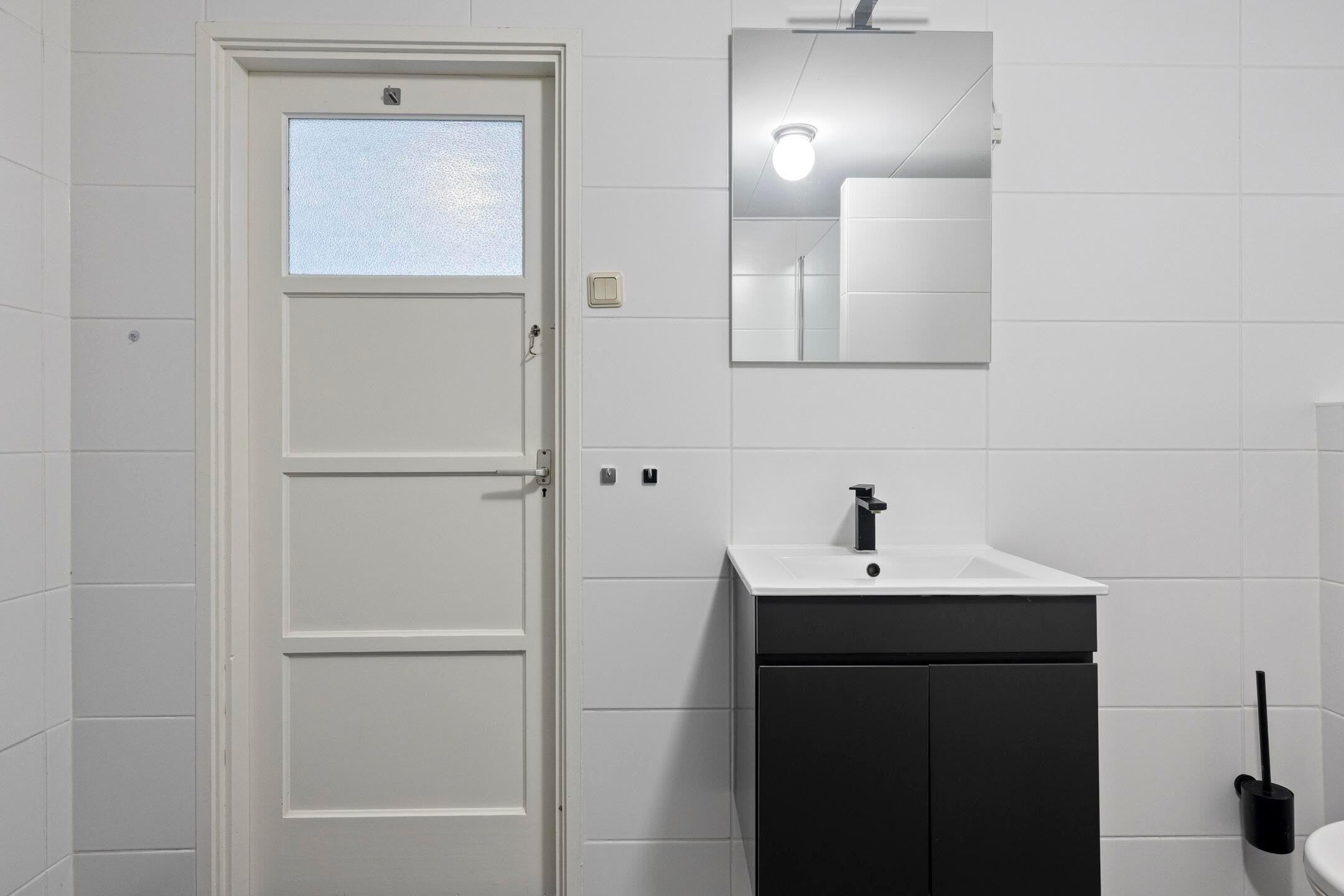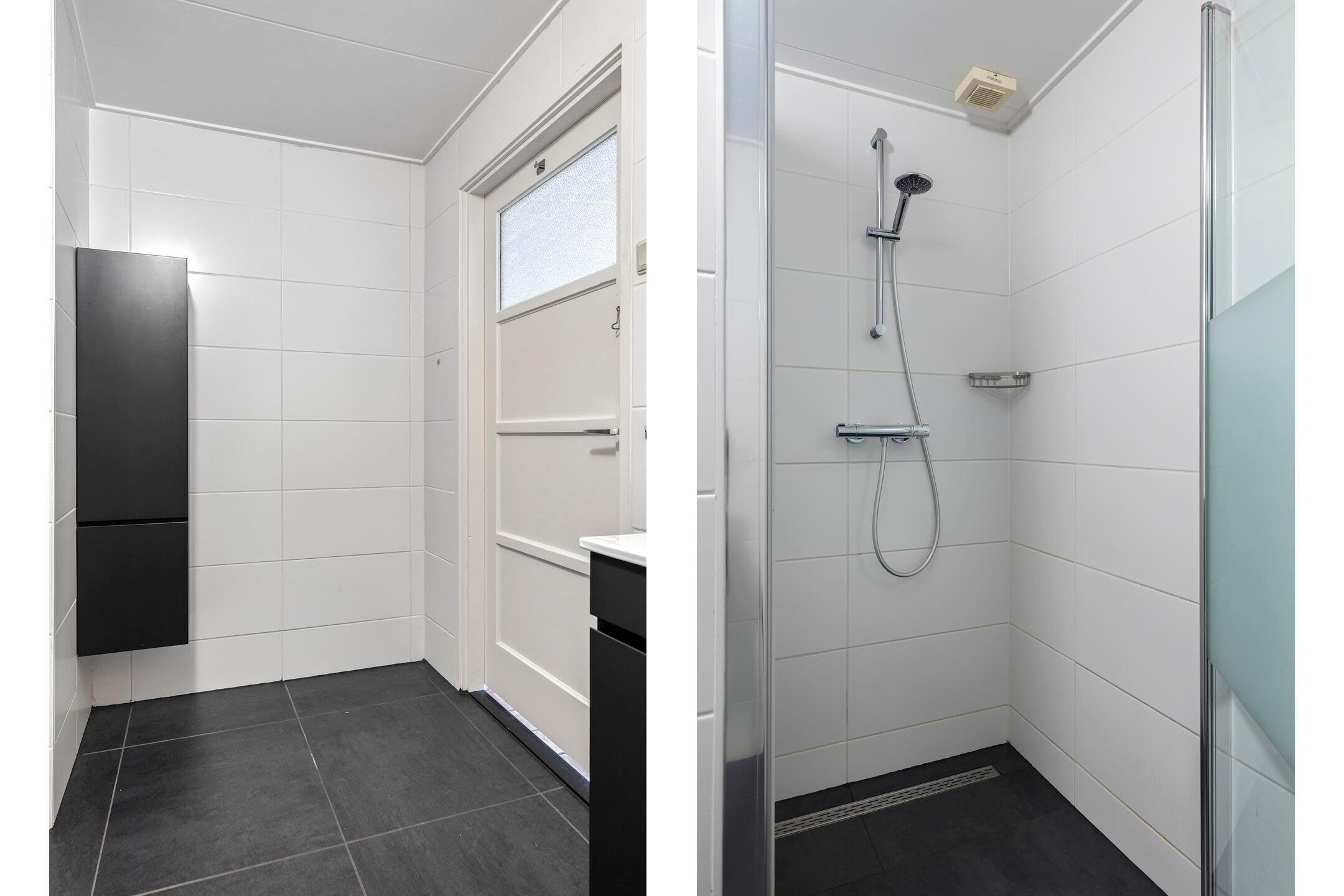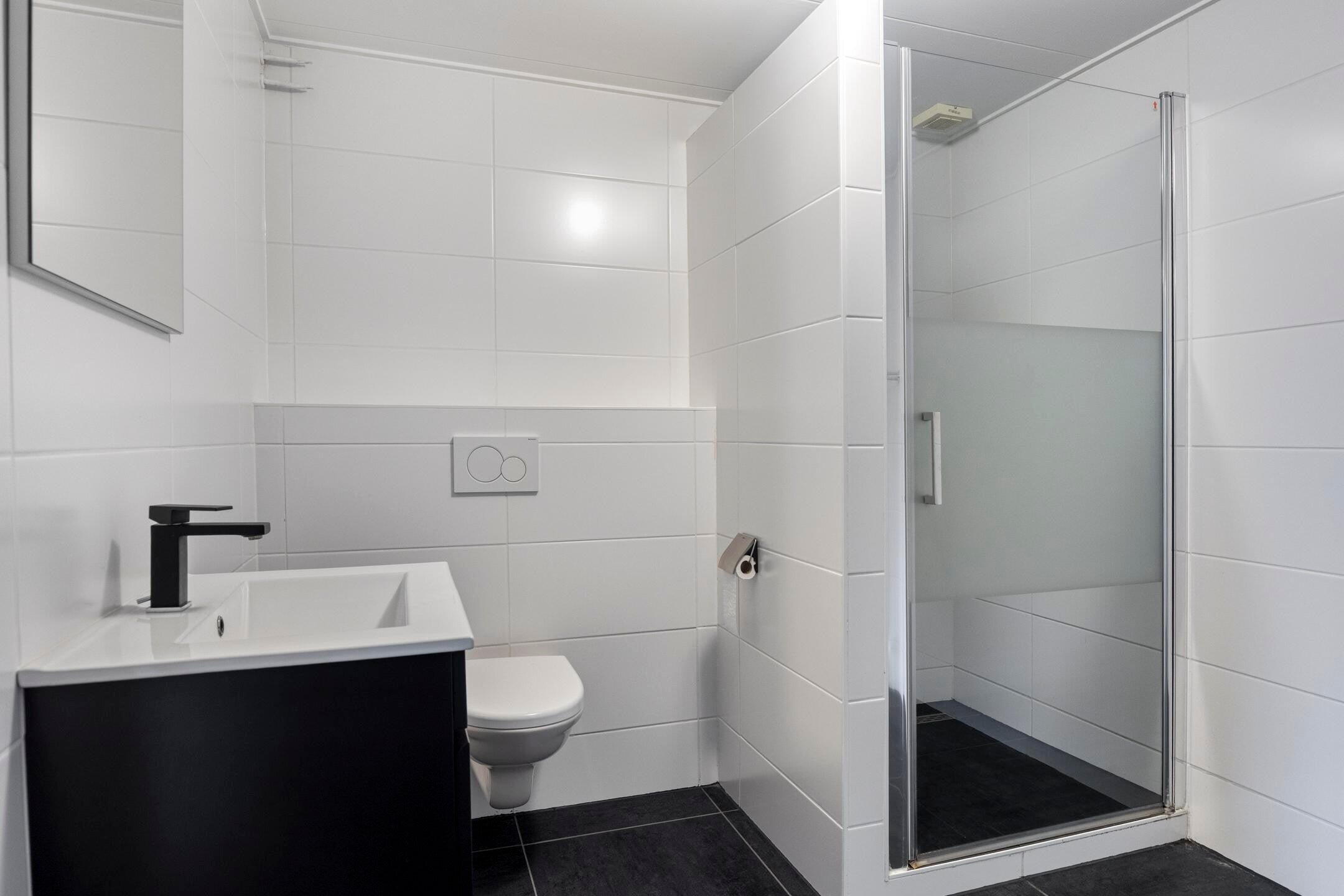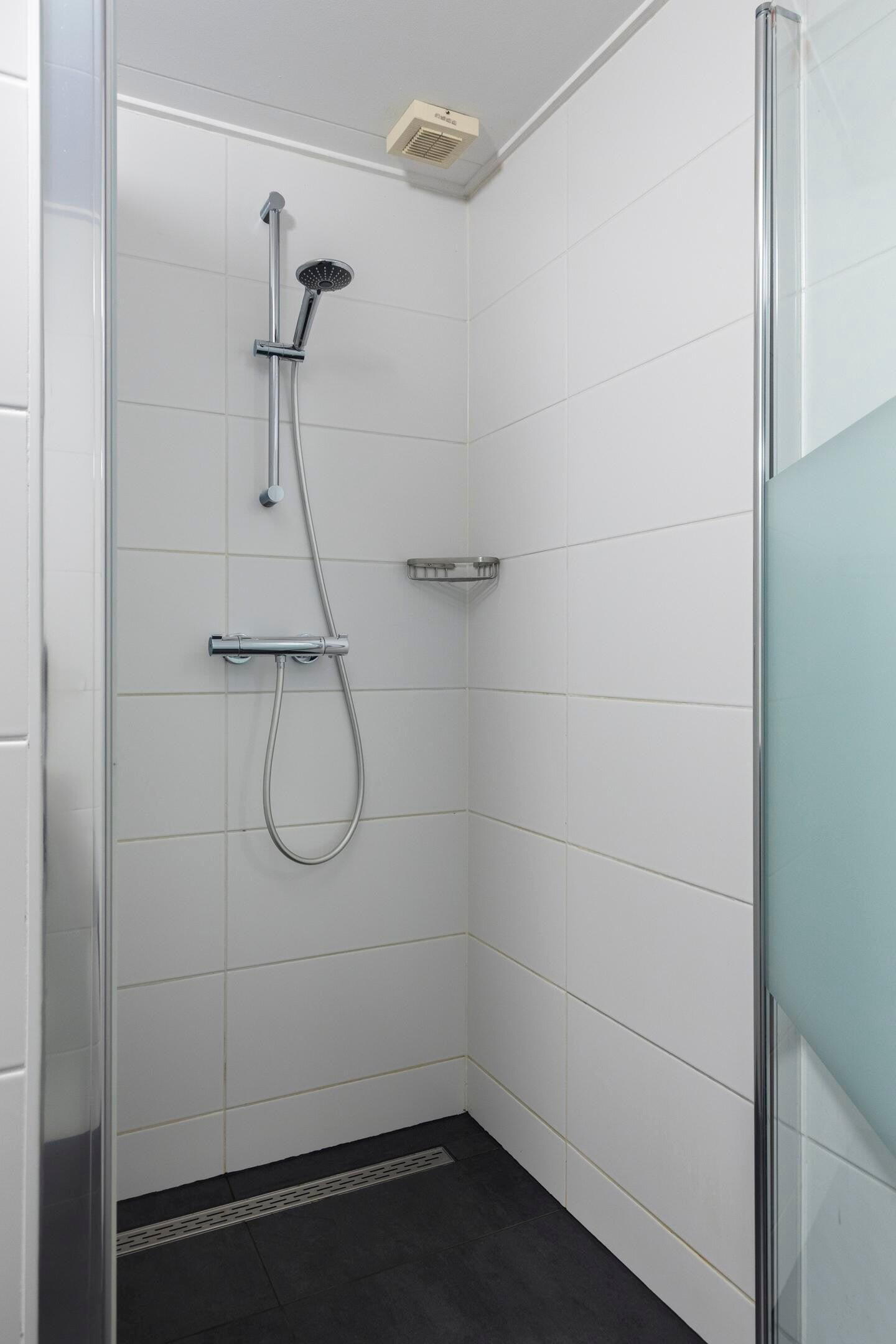 De badkamer, vernieuwd in 2022, meet circa 2,97 m x 2,00 m (ca. 6 m²) en is voorzien van douche, toilet en wastafel. Daarnaast is er een separate wasruimte voor wasmachine en droger.